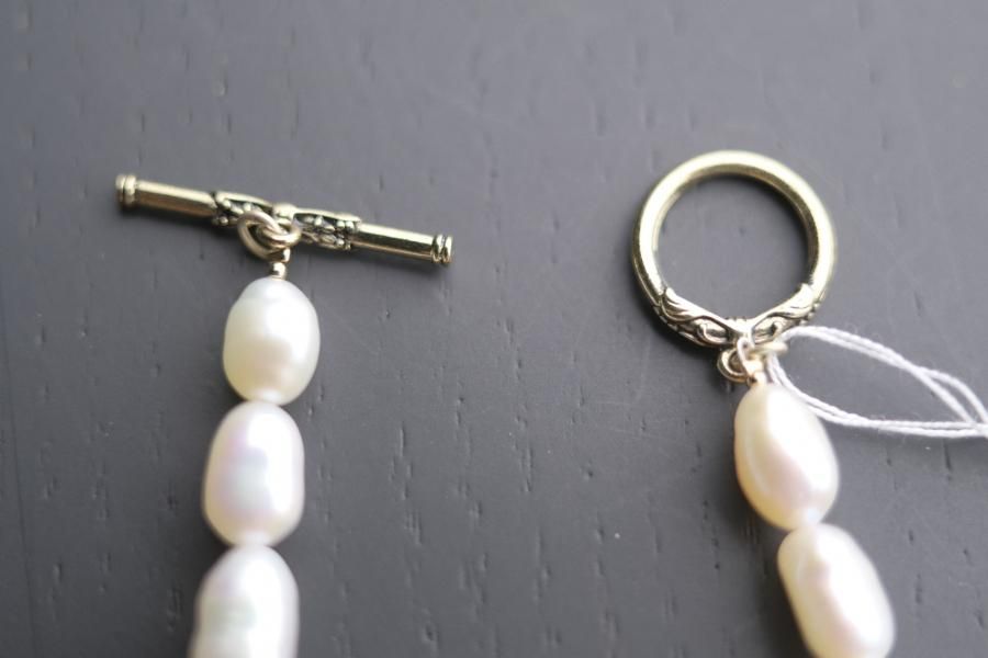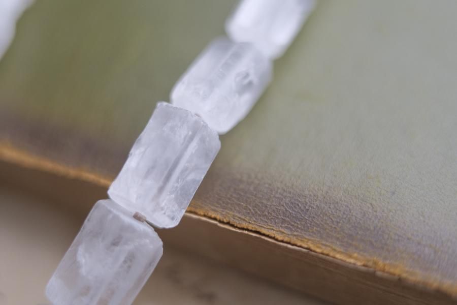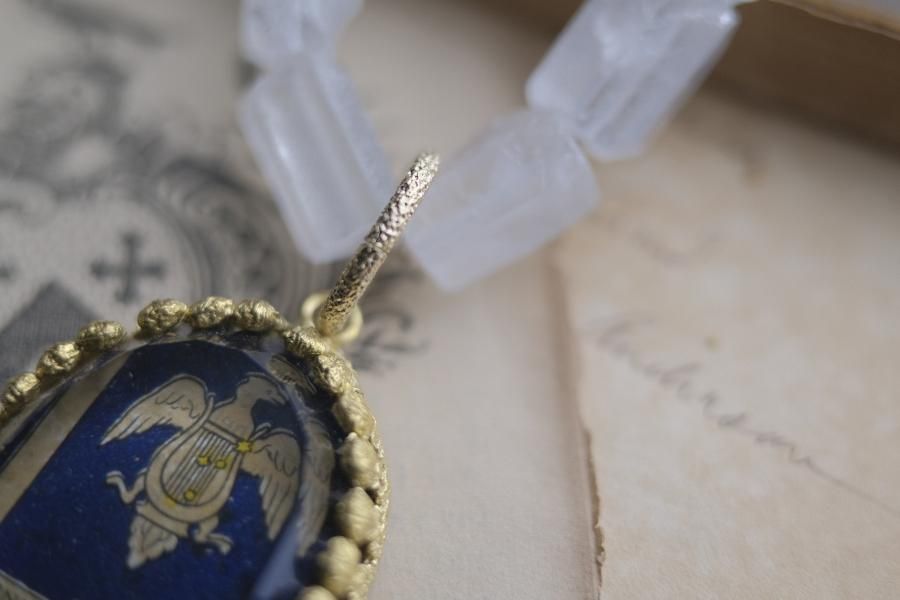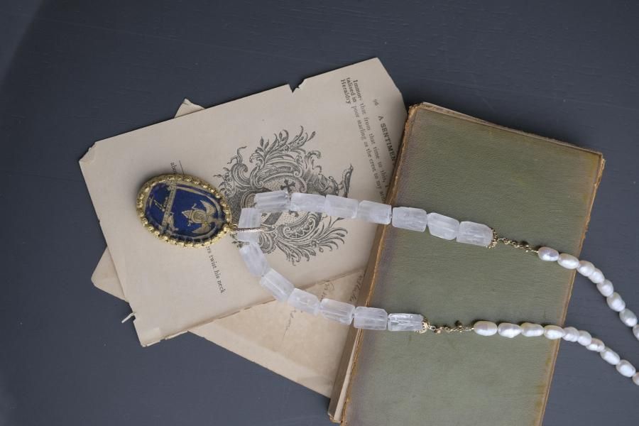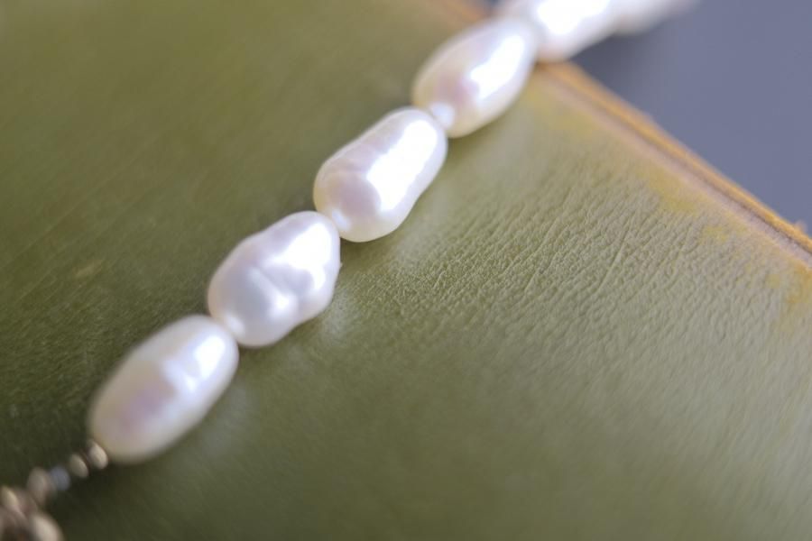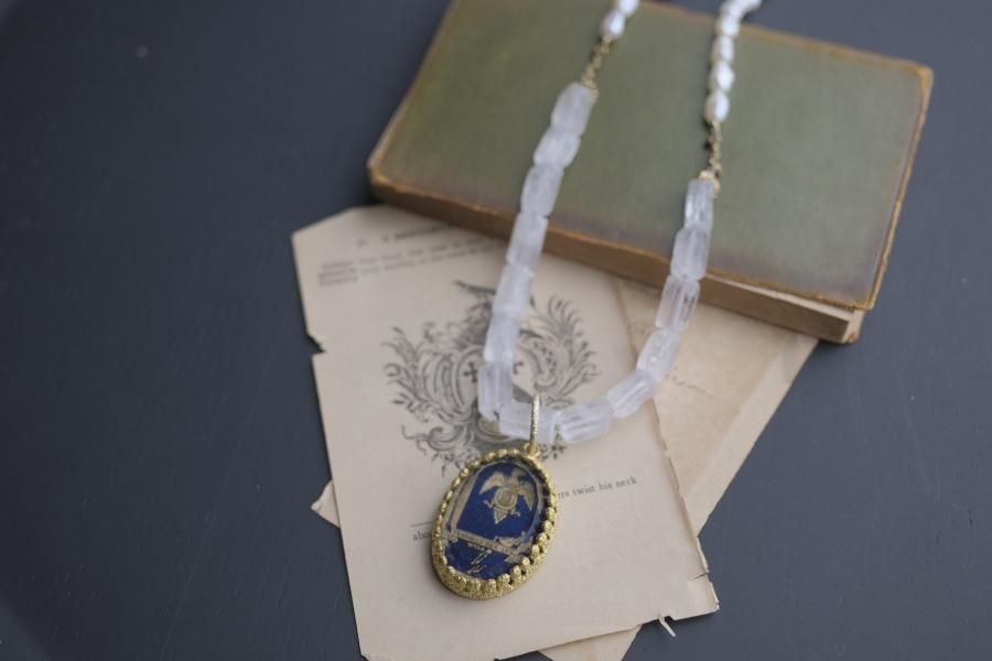 チェーンはパール、珊瑚、クォーツ(水晶)などの天然石を使用しており、