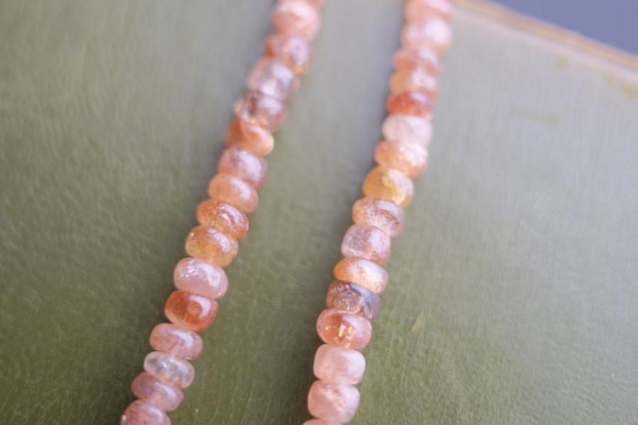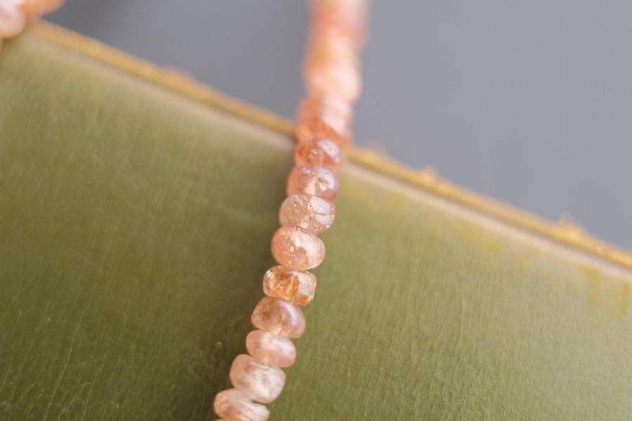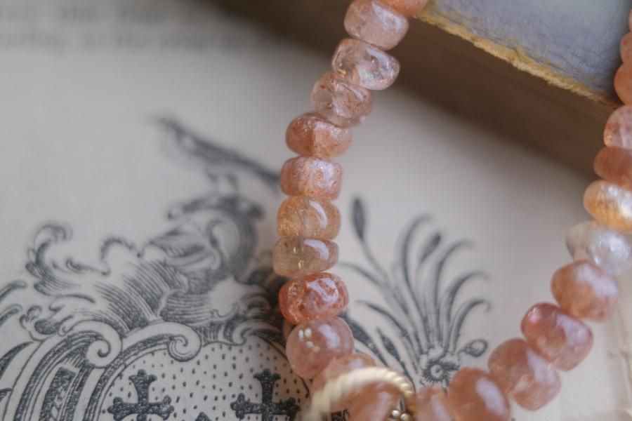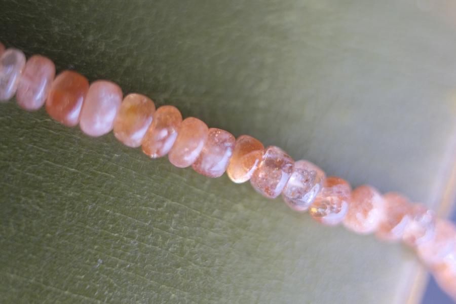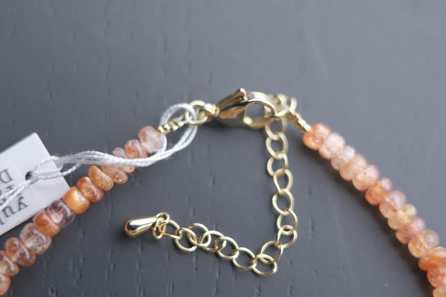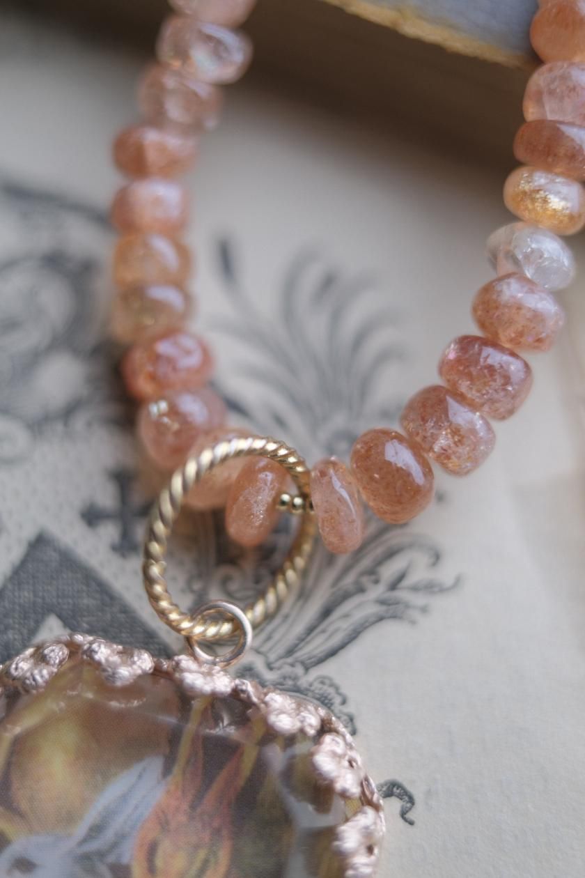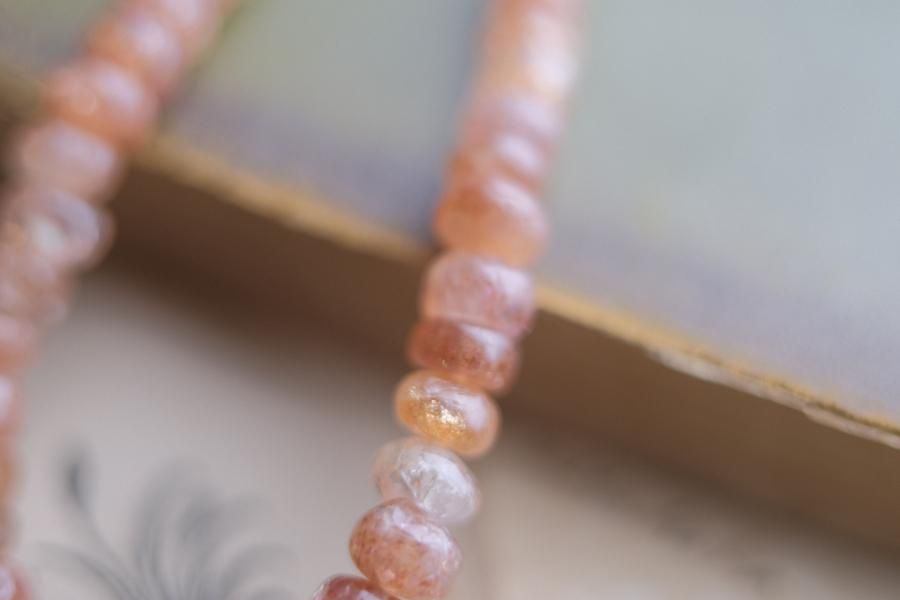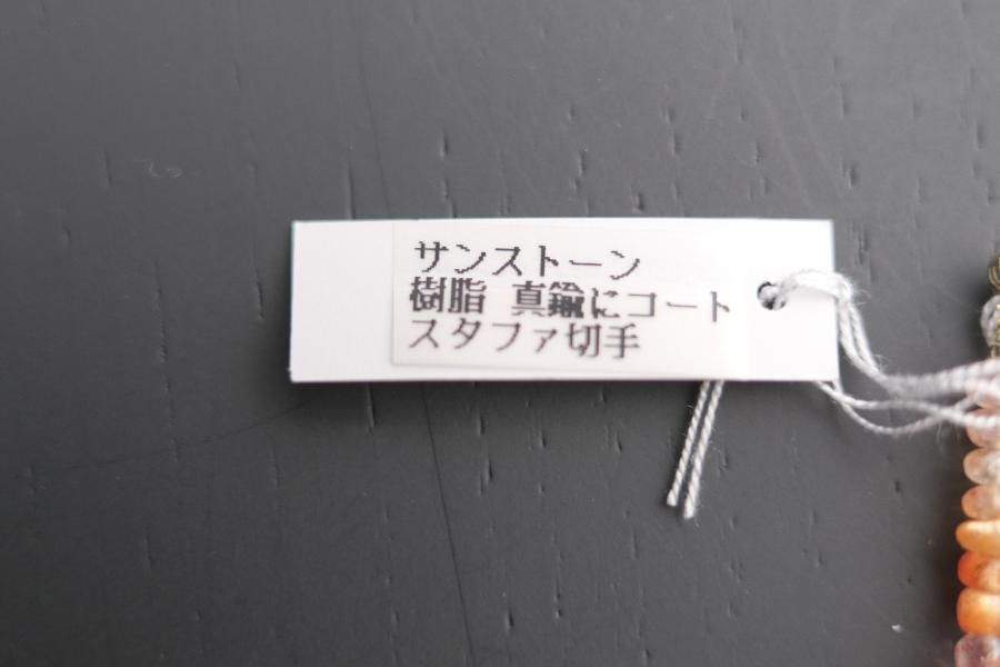 チェーンはパール、珊瑚、クォーツ(水晶)などの天然石を使用しており、