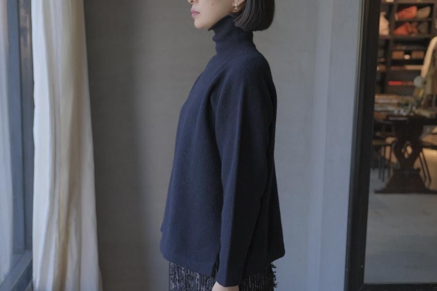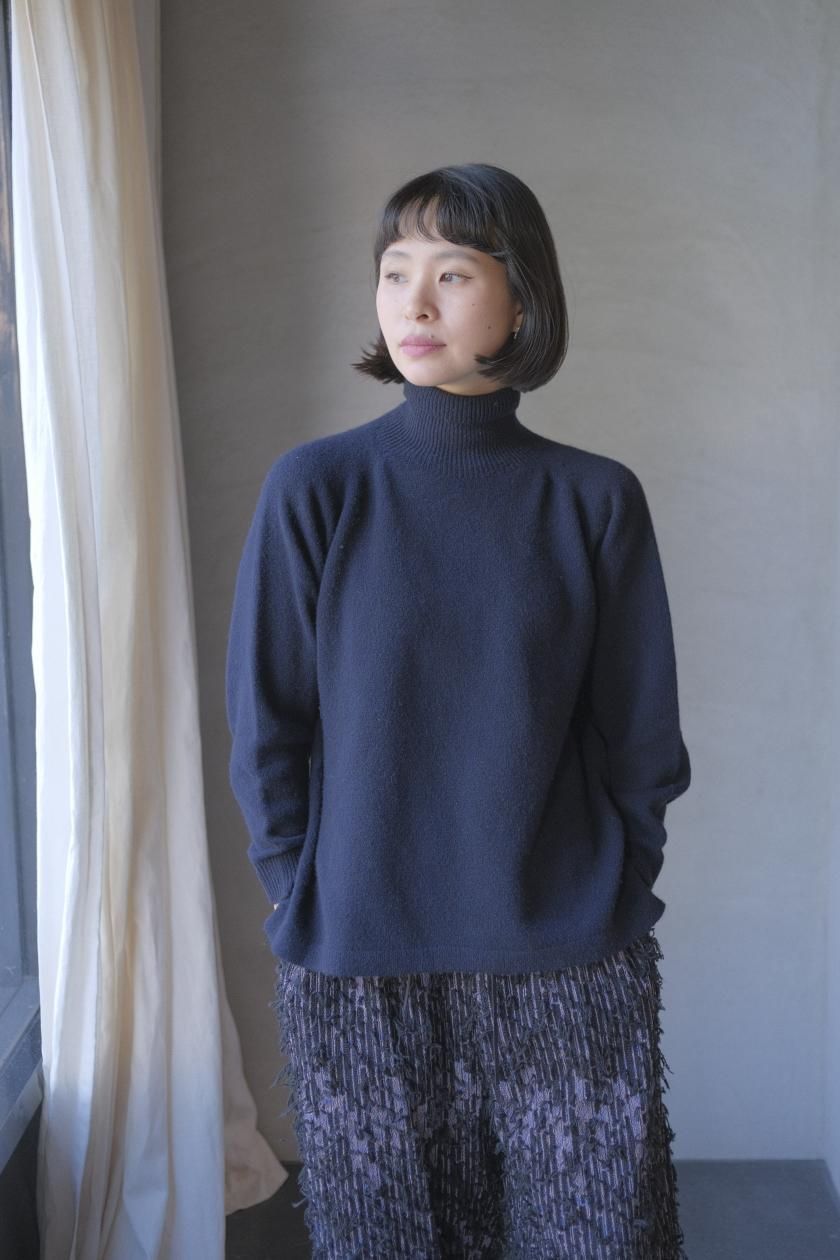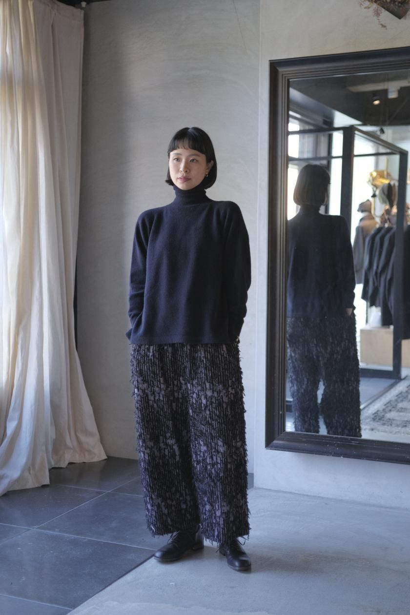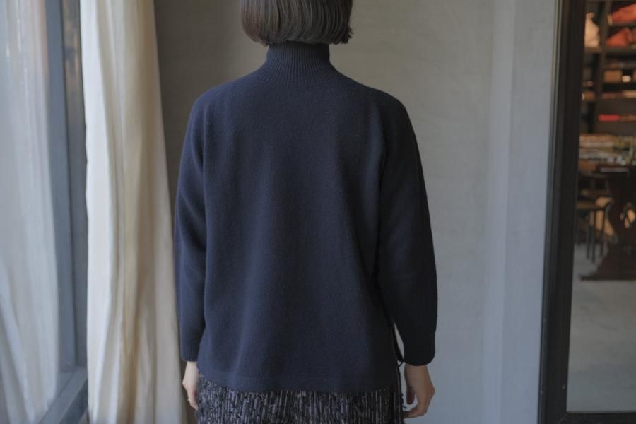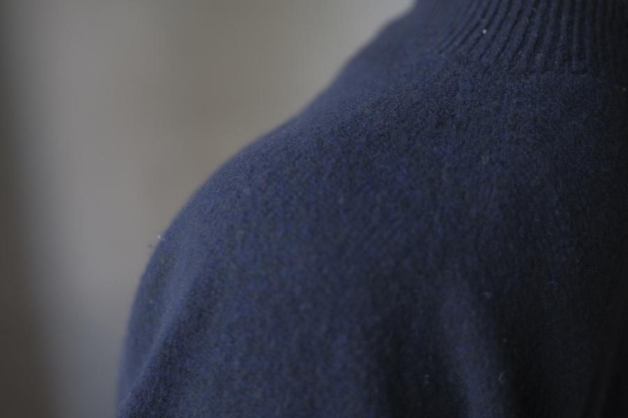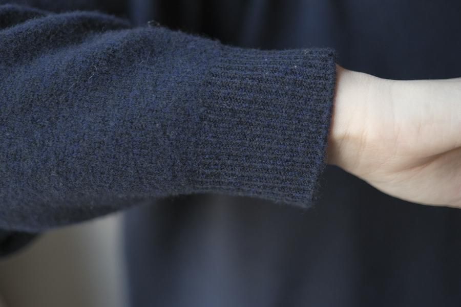 ウルグアイ産の平均繊度15.5マイクロンという超極細のメリノウールを使用しています。滑らかでありながら、縮絨を加えることで嵩高性が生まれ、カシミヤに近い肌触りが特徴です。このウールは、MITTANの製品では初めて3本取りの糸として採用され、しっかりとしたボリューム感のあるミドルゲージのニットに仕上がっています。ウルグアイで紡績され、ノンミュールジングにより羊への負担が軽減されています。ホールガーメント編成機を使用して、糸から1着まるごと編み上げる技術で作られています。縫い代がないのが特徴で、平面的なシルエットが生まれ、特有のデザインが強調されています。脇のスリットにより、パンツのポケットへのアクセスが容易で、動きやすさも考慮されています。締め付け感がなく、リラックスして着用できるラインが特徴です。ワイドシルエットと短めの丈感で、多様なコーディネートに対応できるアイテムです。