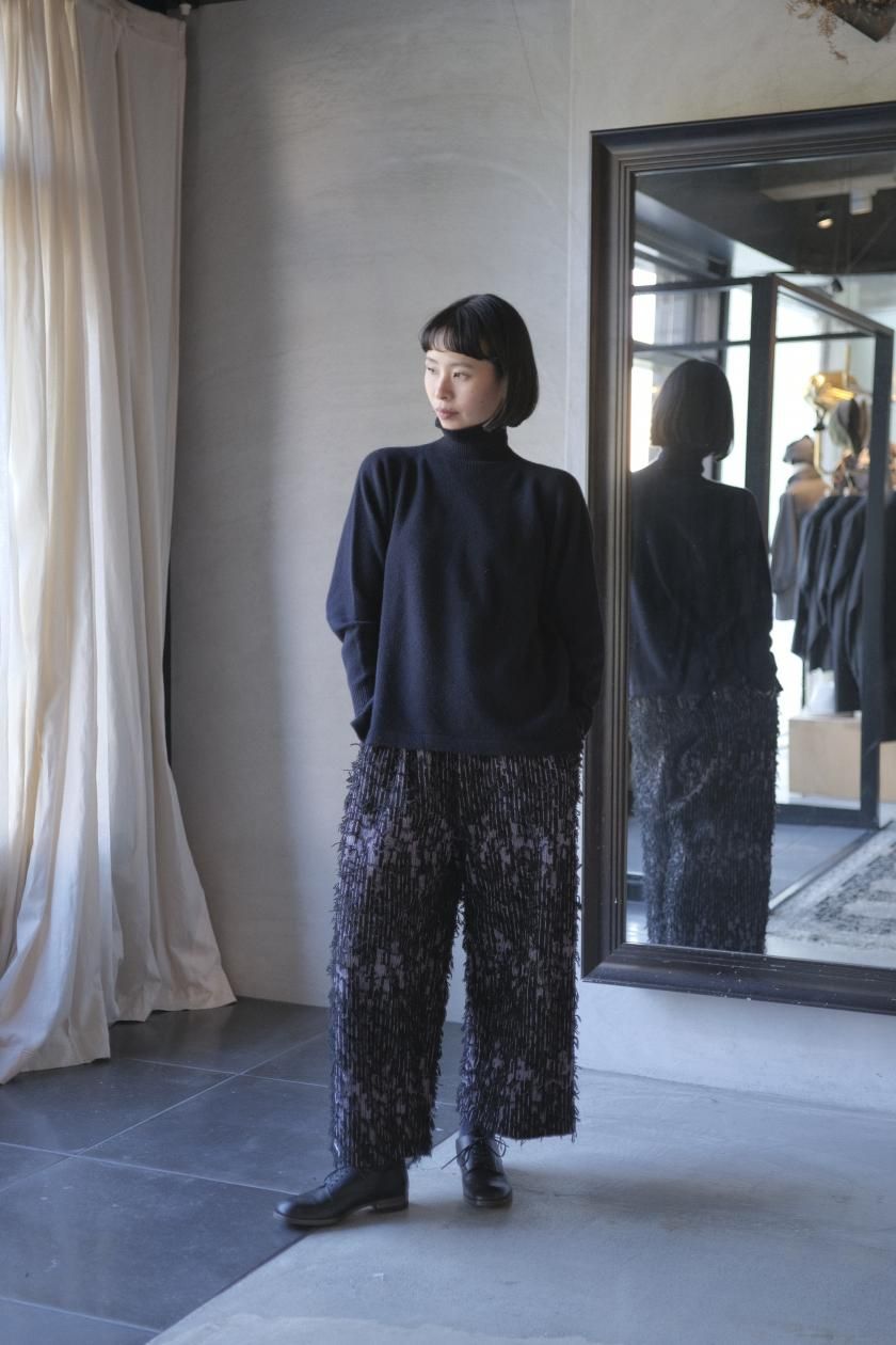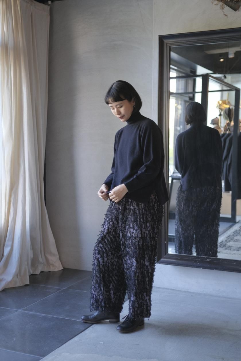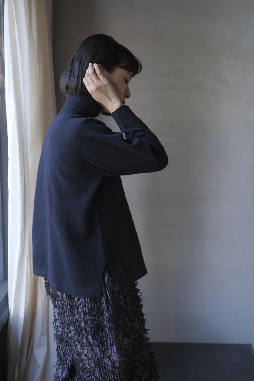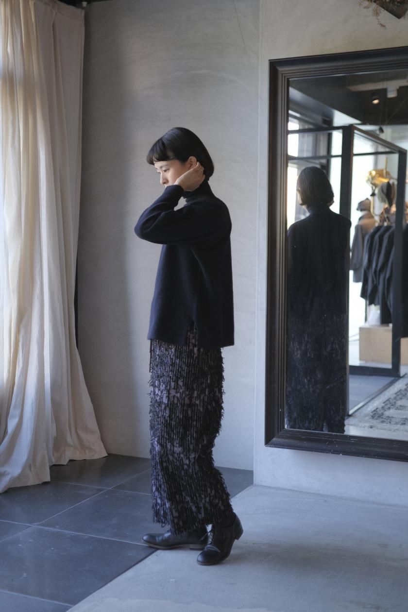 ウルグアイ産の平均繊度15.5マイクロンという超極細のメリノウールを使用しています。滑らかでありながら、縮絨を加えることで嵩高性が生まれ、カシミヤに近い肌触りが特徴です。このウールは、MITTANの製品では初めて3本取りの糸として採用され、しっかりとしたボリューム感のあるミドルゲージのニットに仕上がっています。ウルグアイで紡績され、ノンミュールジングにより羊への負担が軽減されています。ホールガーメント編成機を使用して、糸から1着まるごと編み上げる技術で作られています。縫い代がないのが特徴で、平面的なシルエットが生まれ、特有のデザインが強調されています。脇のスリットにより、パンツのポケットへのアクセスが容易で、動きやすさも考慮されています。締め付け感がなく、リラックスして着用できるラインが特徴です。ワイドシルエットと短めの丈感で、多様なコーディネートに対応できるアイテムです。