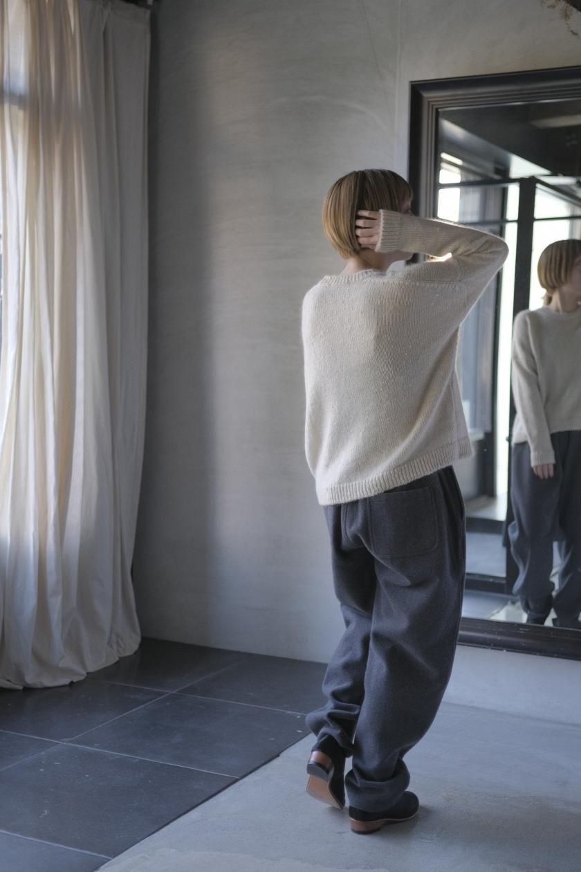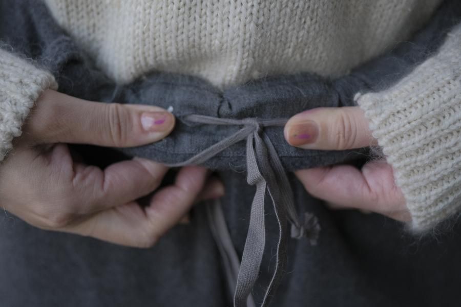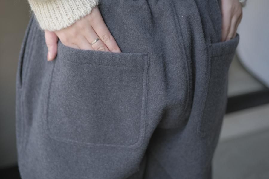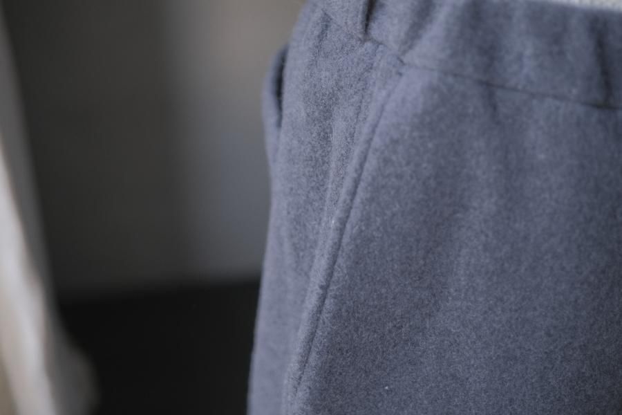 自重に耐えられるようにベルトループが付いていますが、ウエストゴムと内側の紐でベルトを用いなくても着用が可能です。比較的強めのテーパードが入っていて、生地厚の割にはスッキリとしたシルエットとなっています。ロールアップでの調整も可能で、インナーを調整する事で真冬まで対応が可能です。1枚仕立てですがベルト裏とポケットにもウールを使用しております。