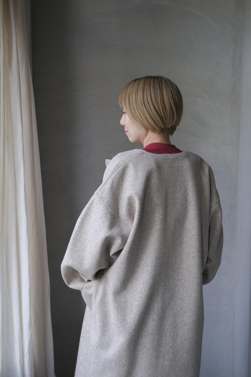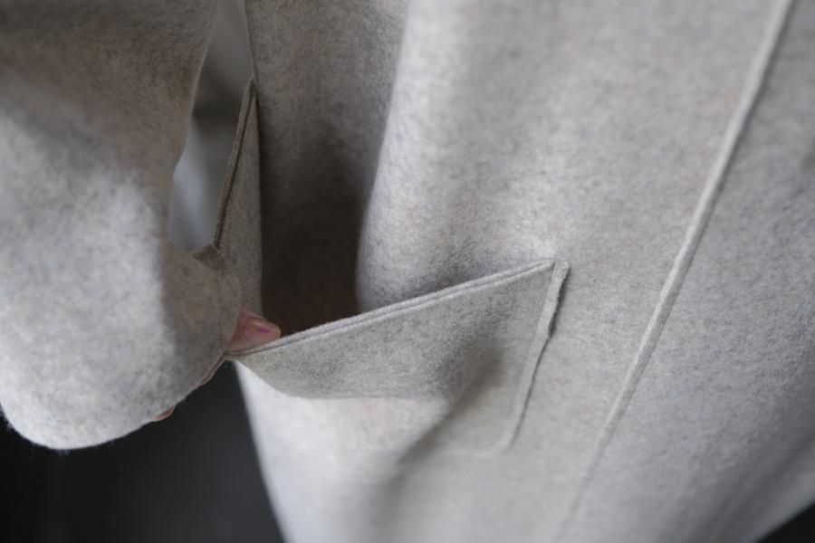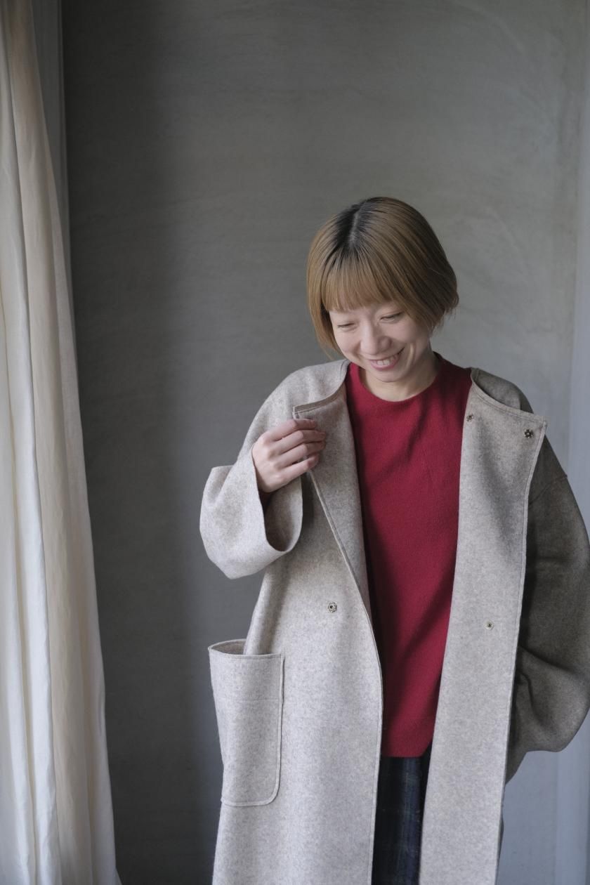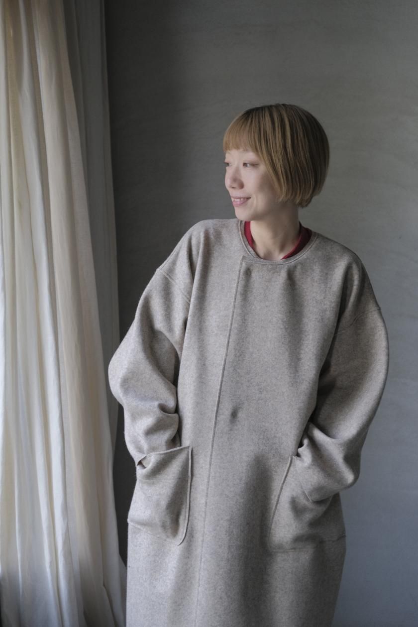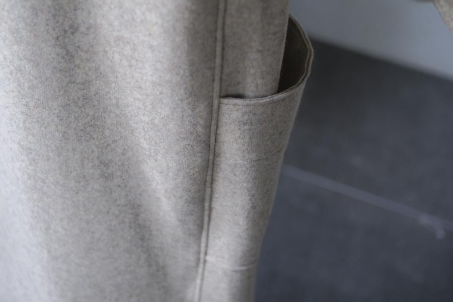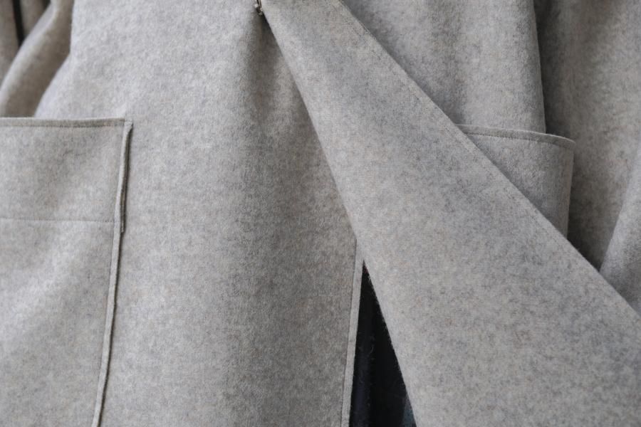 デザインは、生地の特性を活かした全て断ち切りの仕様となっています。平面的でワイドなシルエットが特徴で、厚手のセーターや着物とも相性が良く、ゆとりのある着こなしを楽しむことができます。また、重ね着をすることで真冬まで対応が可能です。両サイドには大きなポケットも付いています。