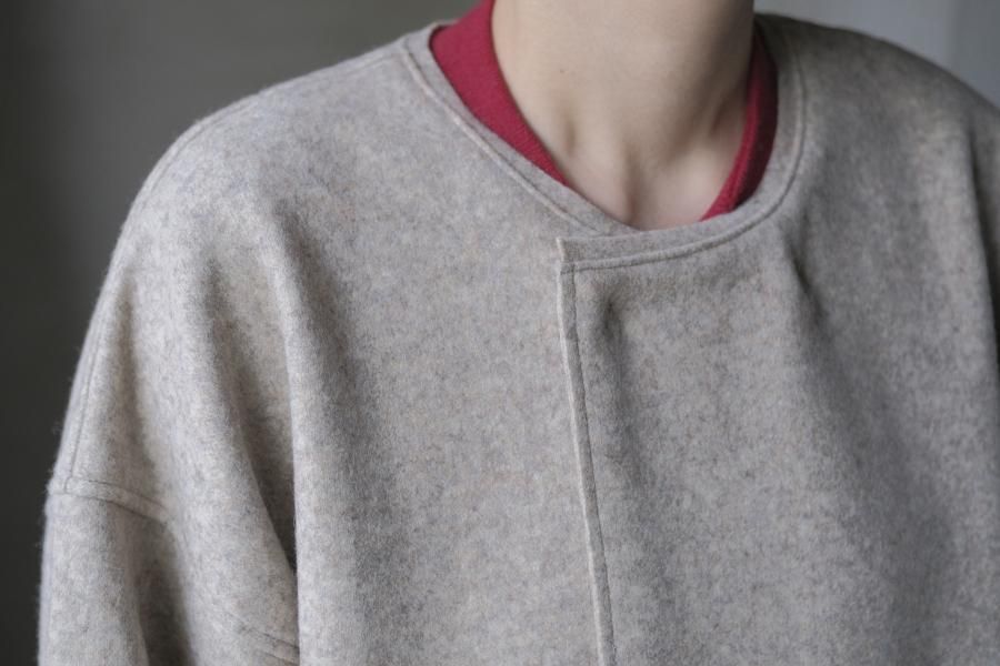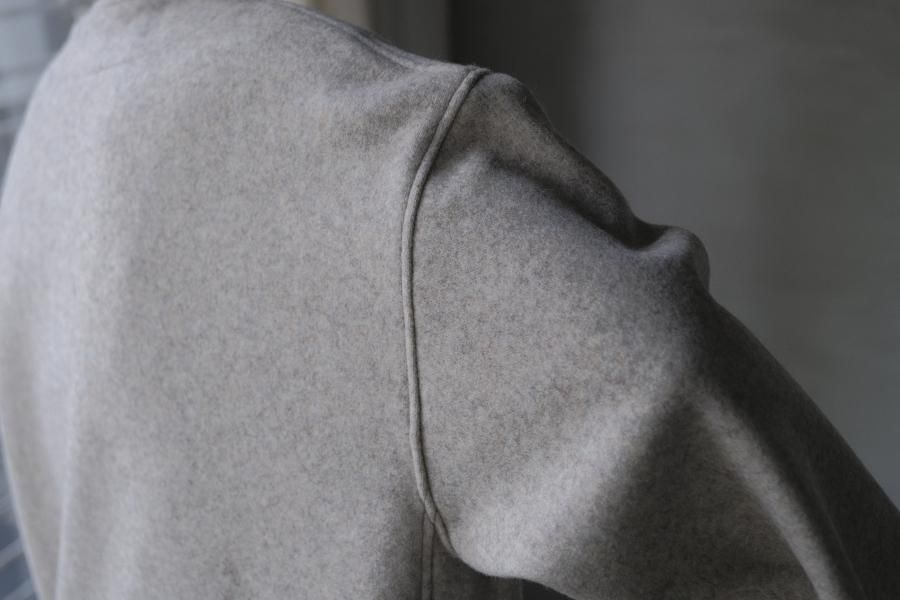 和歌山県で作られたジャージ生地で、原料にはオーストラリア産のウールが使用されています。ゆるめに編み上げた後には、しっかりと縮絨が施されることで、ニットの伸縮性とウールの保温性を兼ね備えた特徴があります。また、しっかりとした厚みがありながらも、比較的軽量な素材です。